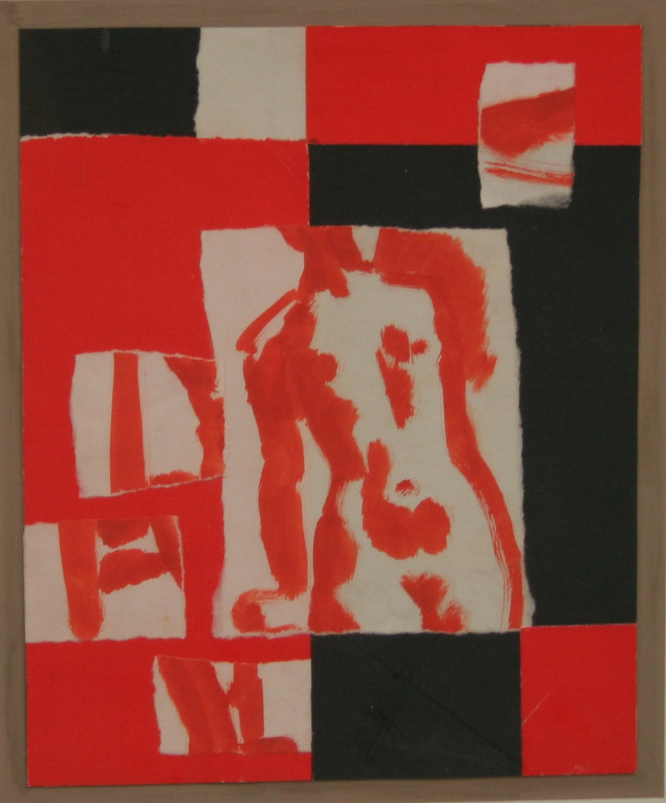 Abstracte compositie van een naakt persoon. De figuur is op een apart vel papier in rode verfstrepen afgebeeld, waarna dit vel is verscheurd in min of meer rechte lijnen. Een deel van de verscheurde stukken zijn verspreid op het board opgeplakt. Het grootste stuk, die van het torso, is in het midden van het board geplakt. Het hoofd, de benen en de linkerarm zijn niet zichtbaar.