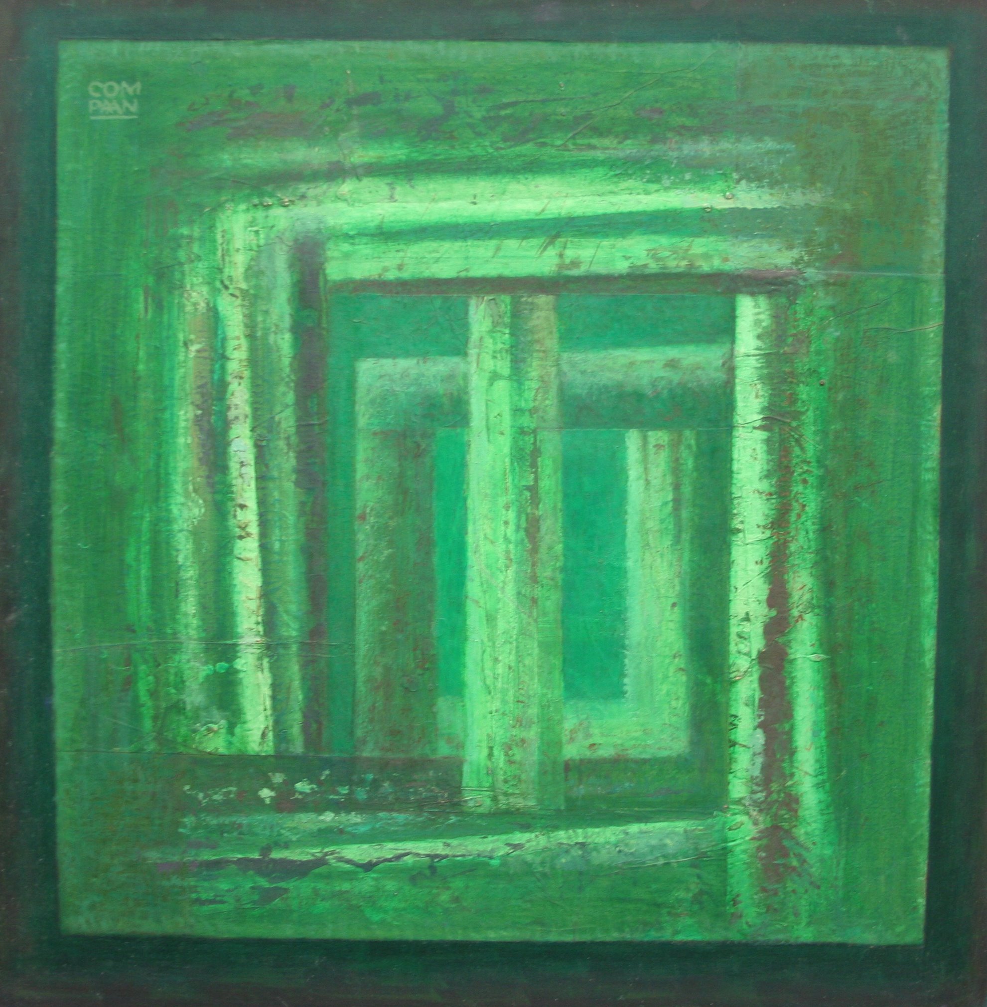 Abstracte compositie in verschillende tinten groen. De compositie is met pakpapier dat op het board geplakt is. De compositie bestaat uit een paar horizontale en verticale balken, die een paar vierkanten en rechthoeken vormen. In het midden van de compositie zijn de kleuren lichter dan aan de randen.