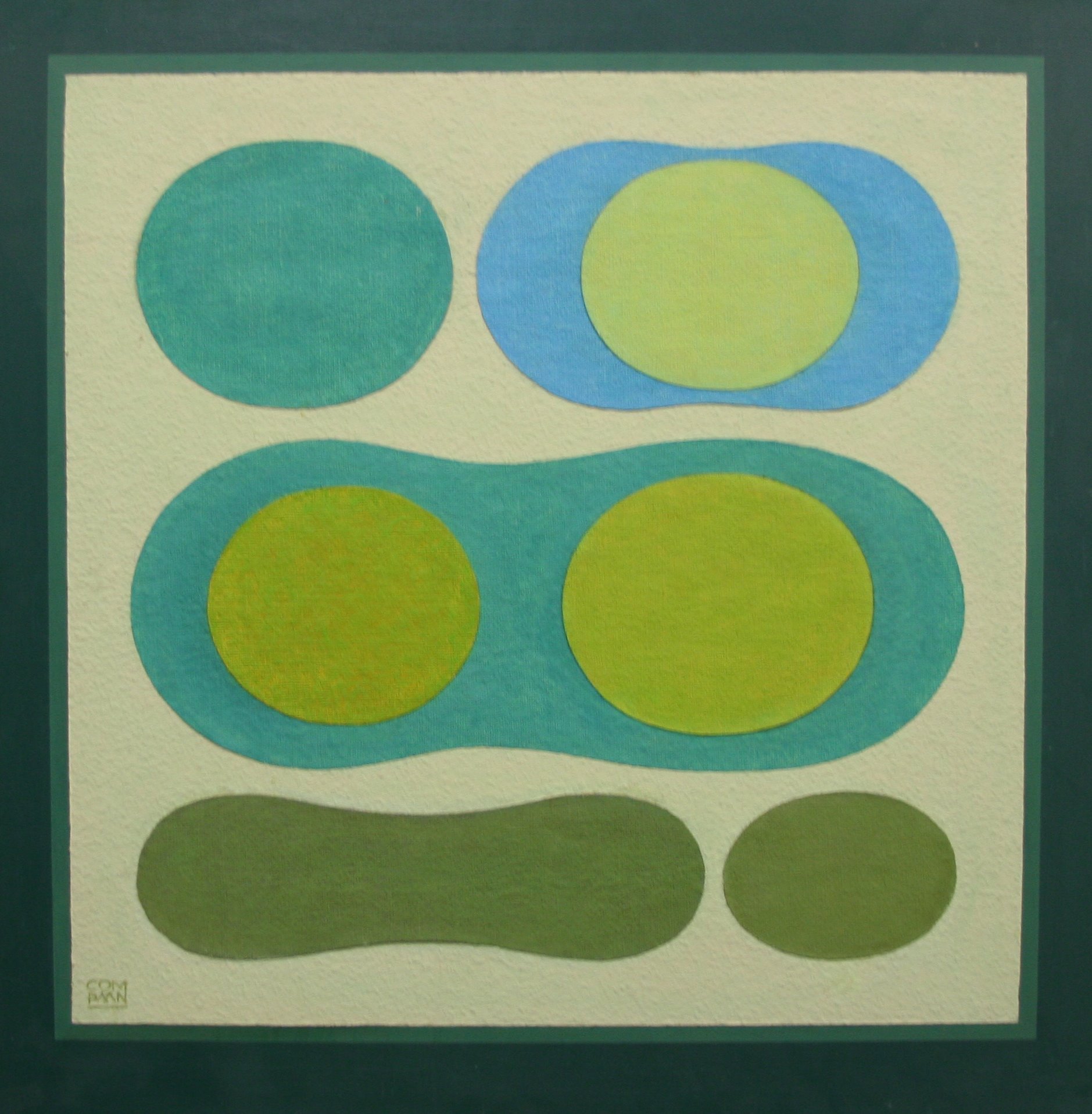 Abstracte compositie van ronde figuren in voornamelijk groene tinten. Bovenaan zijn twee figuren, waarvan de linker groenblauw is. De rechter figuur is lichtblauw en heeft in het midden een beige cirkel. In het midden is één grote, langgerekte blauwgroene figuur met links en rechts in de figuur twee olijfgroene cirkels. Onderaan zijn twee legergroene figuren afgebeeld, waarvan de linker langgerekt is en de rechter een cirkel is.