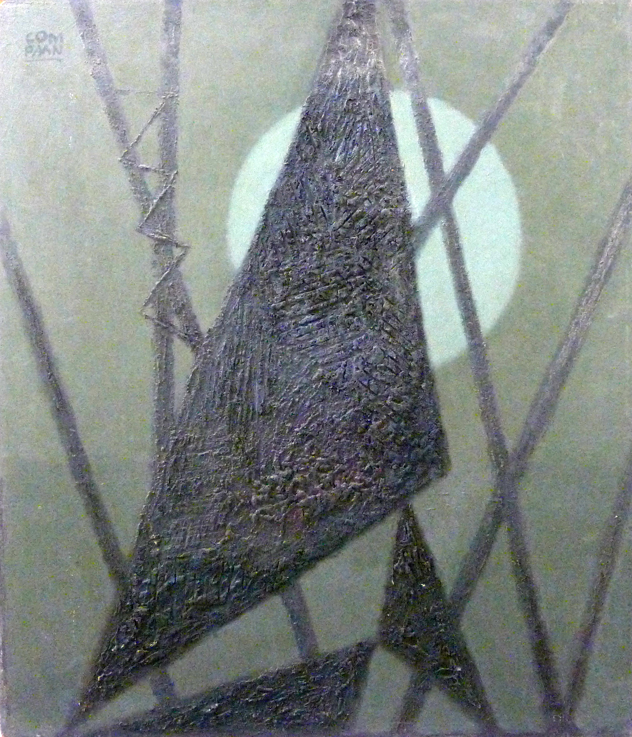 Abstracte compositie van driehoeken en lijnen in sombere kleuren. In het midden van boven naar beneden is een grote zwarte driehoek met eronder twee kleine zwarte driehoeken afgebeeld. De driehoeken zijn ruw van structuur door het gebruikte materiaal. Van boven naar beneden lopen zwarte diagonale lijnen, die elkaar en de driehoeken deels kruisen. Achter de grote driehoek is bovenaan een lichtgrijze cirkel afgebeeld, die zeer contrasteert met de donkere driehoeken en lijnen en de grijsgroene achtergrond.
