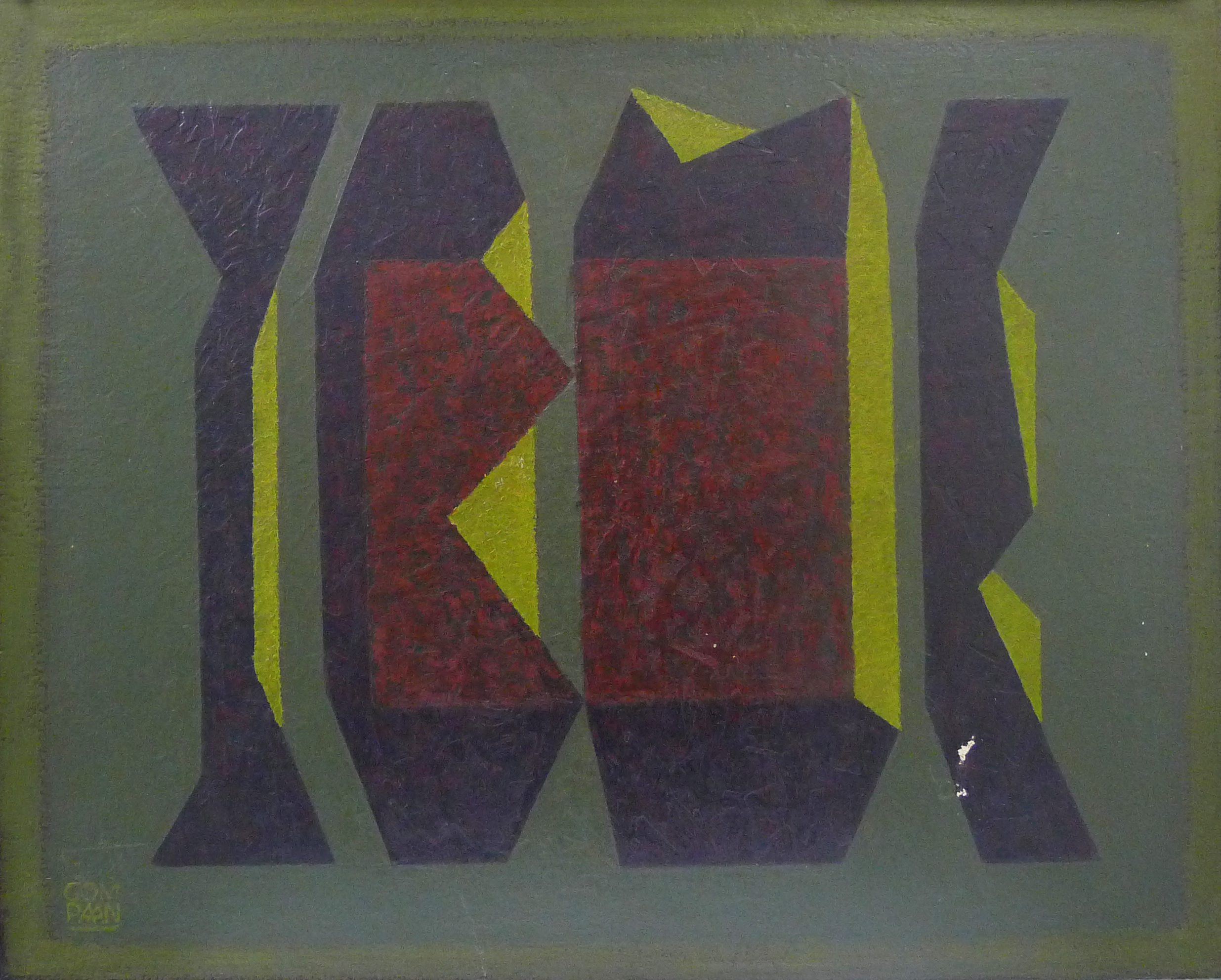Abstracte compositie waarop vier quasi-wiskundige vormen staan, die vage reminiscenties oproepen aan grafmonumenten, maar meer nog herinneren aan tekens en aan schrift. De tekens bedekken vrijwel het gehele kunstwerk. De ordening is rustig. De complementaire kleuren groen en roodpaars zijn contrastrijk. De rechterzijde van de tekens is groengeel. Het kunstwerk heeft een dubbel kader in groen.