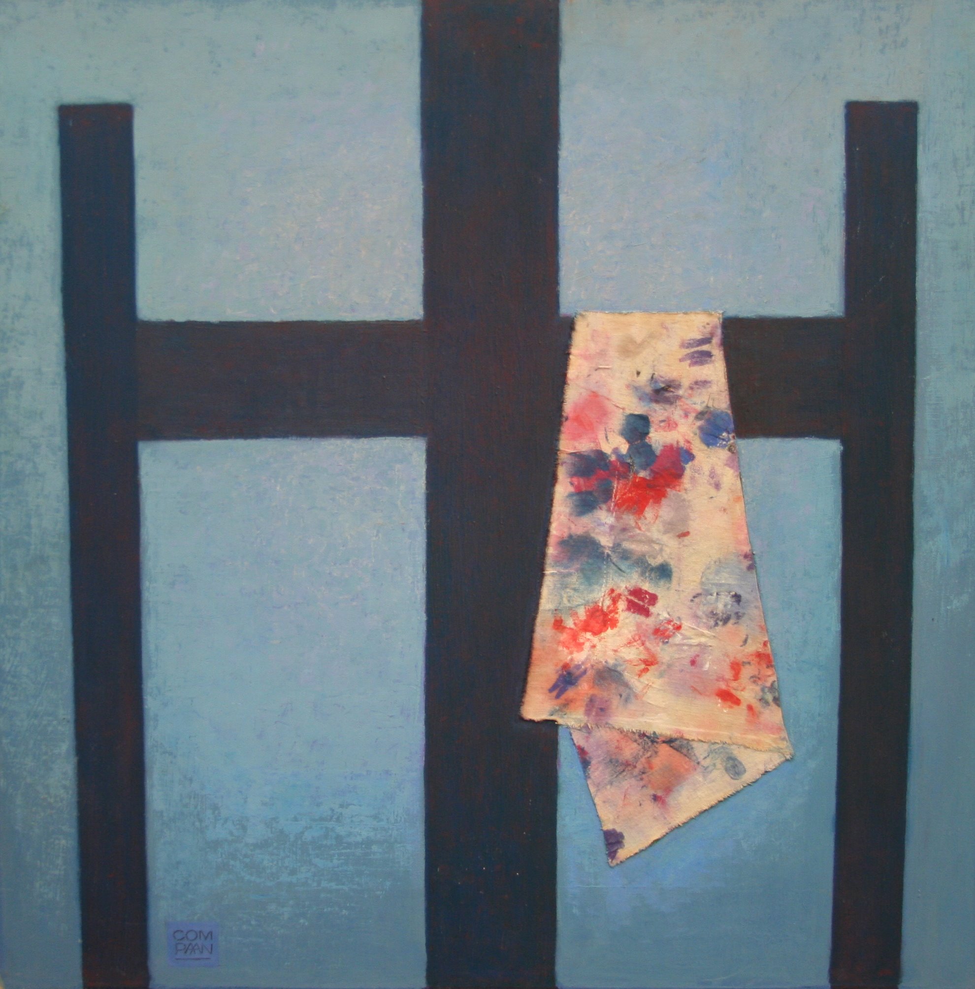 Compositie van een zwarte schildersezel, waarvan slechts het H-frame is afgebeeld. Aan de rechterzijde is op de dwarsbalk een echte schilderslap met verfvlekken in allerlei kleuren aangebracht, waardoor het lijkt alsof de lap over de dwarsblak 'hangt'. De achtergrond is blauw, waardoor er een groot contrast ontstaat met het zwarte H-frame.