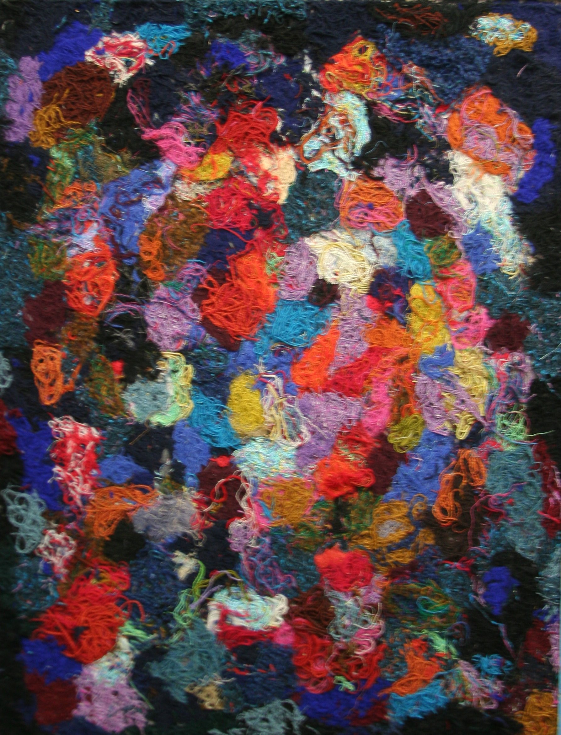 Abstracte compositie van bolletjes wol in allerlei verschillende kleuren, die op willekeurige wijze op het kunstwerk zijn aangebracht. Er zijn geen patronen of figuren waarneembaar. De randen zijn donkerder vergeleken met de rest van het kunstwerk.