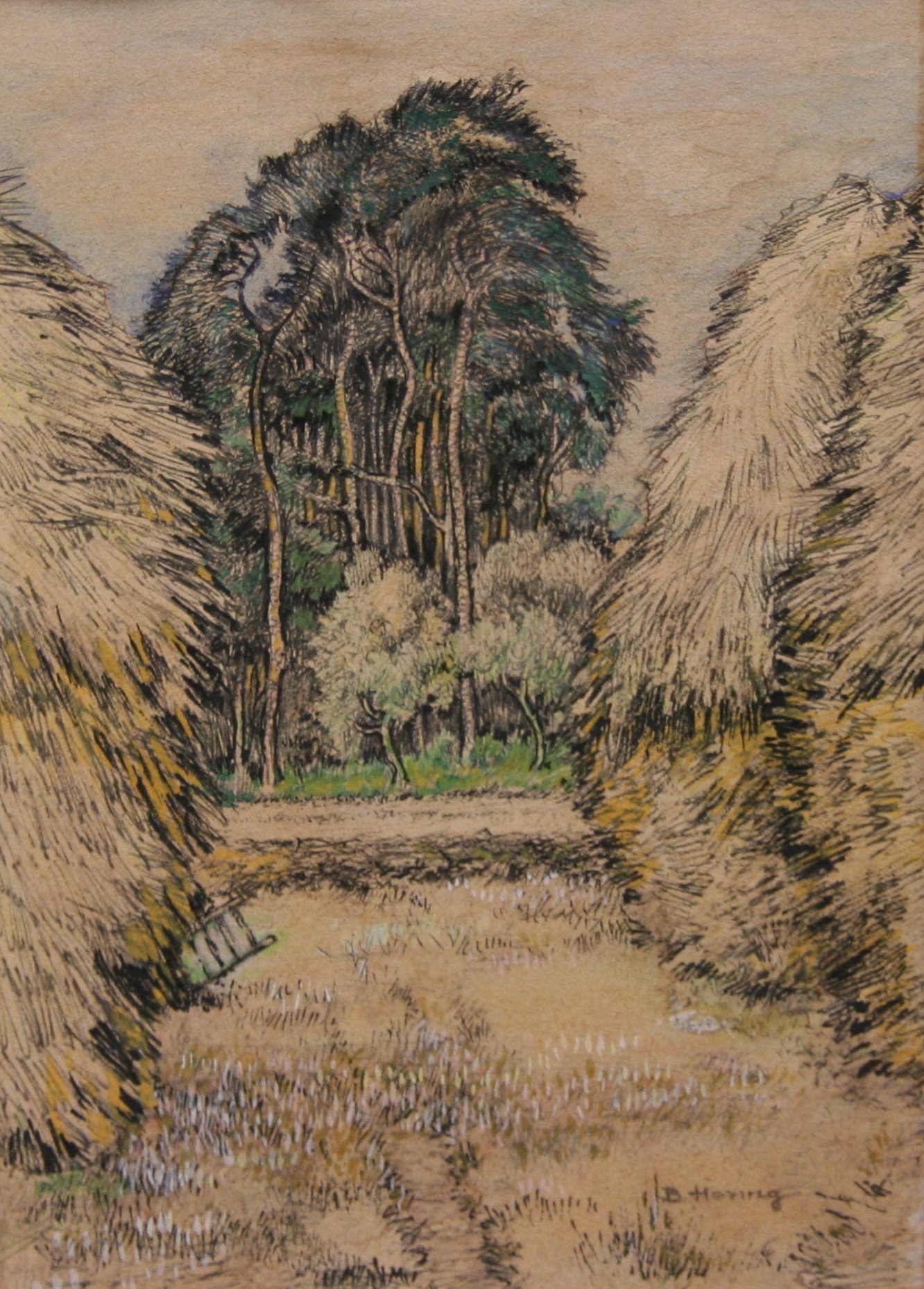 | opschrift | rechtsonder Norg achterkant: Berend Hoving (1901-1986), Korenmijten, Aquarel + pen, 18,5 x 26 cm Indien u geen bestemming meer hebt voor dit werk dan stel ik het op prijs wanneer u het wilt toevoegen aan de collectie van Berend Hoving die wordt beheerd in het depot van de Stichting Behoud Beeldende Kunst Groningen. Greta Oostenbrug-Hoving (dochter van de kunstenaar) |