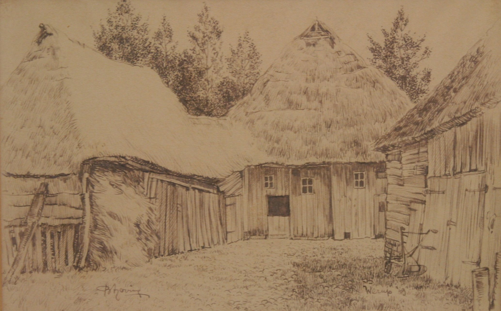Het is zomer wat blijkt uit de bomen die vol in blad zijn. Door de rechter schuur is er een duidelijk perspectief ontstaan. De tekening bevat veel details in vooral de rieten daken en de houten planken.