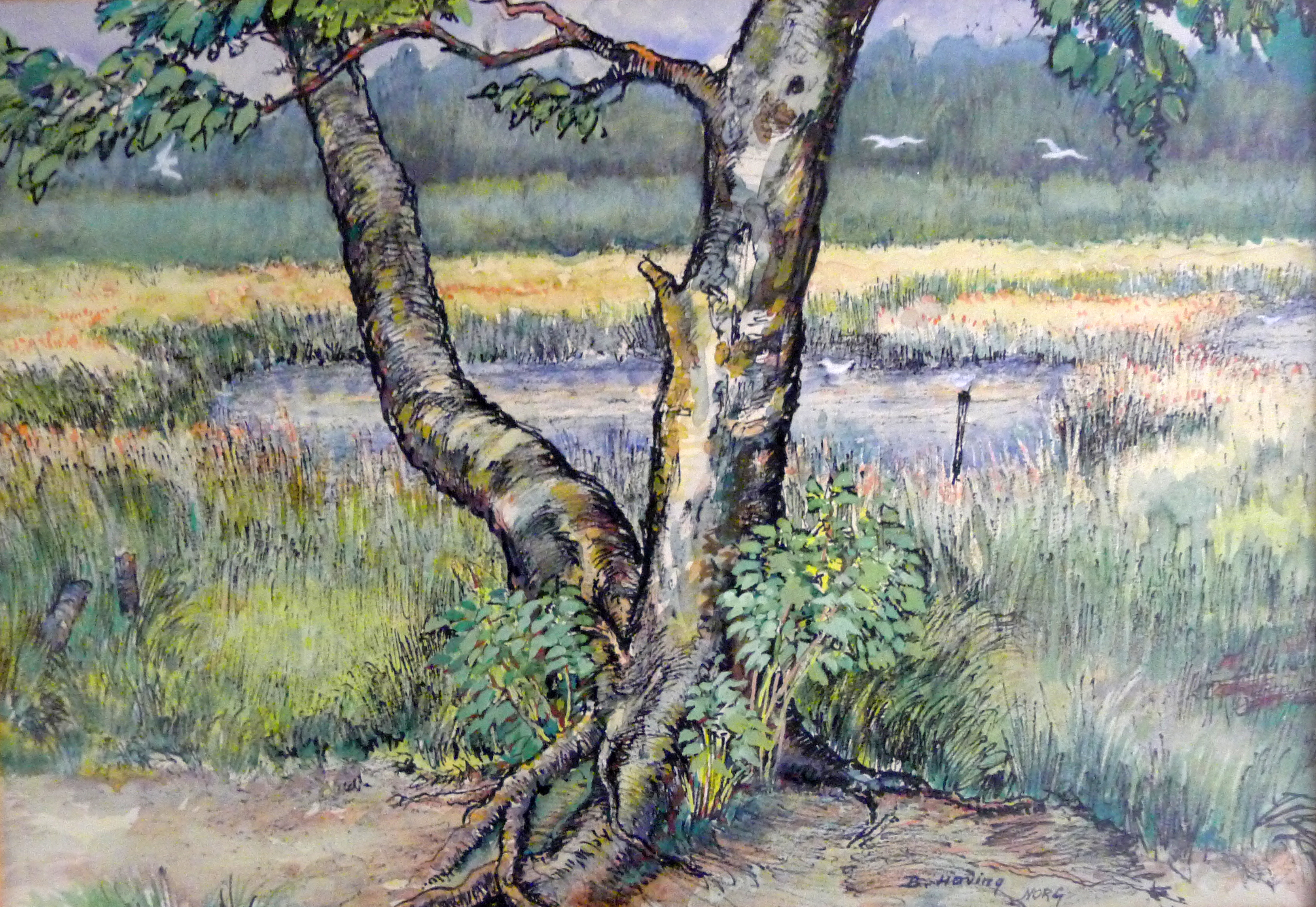 | opschrift | rechtsonder Norg achterkant: Berend Hoving (1901-1986), Vennetje in Norg, Gouache + pen, 32 x 22,5 cm Indien u geen bestemming meer hebt voor dit werk dan stel ik het op prijs wanneer u het wilt toevoegen aan de collectie van Berend Hoving die wordt beheerd in het depot van de Stichting Behoud Beeldende Kunst Groningen. Greta Oostenbrug-Hoving (dochter van de kunstenaar) |