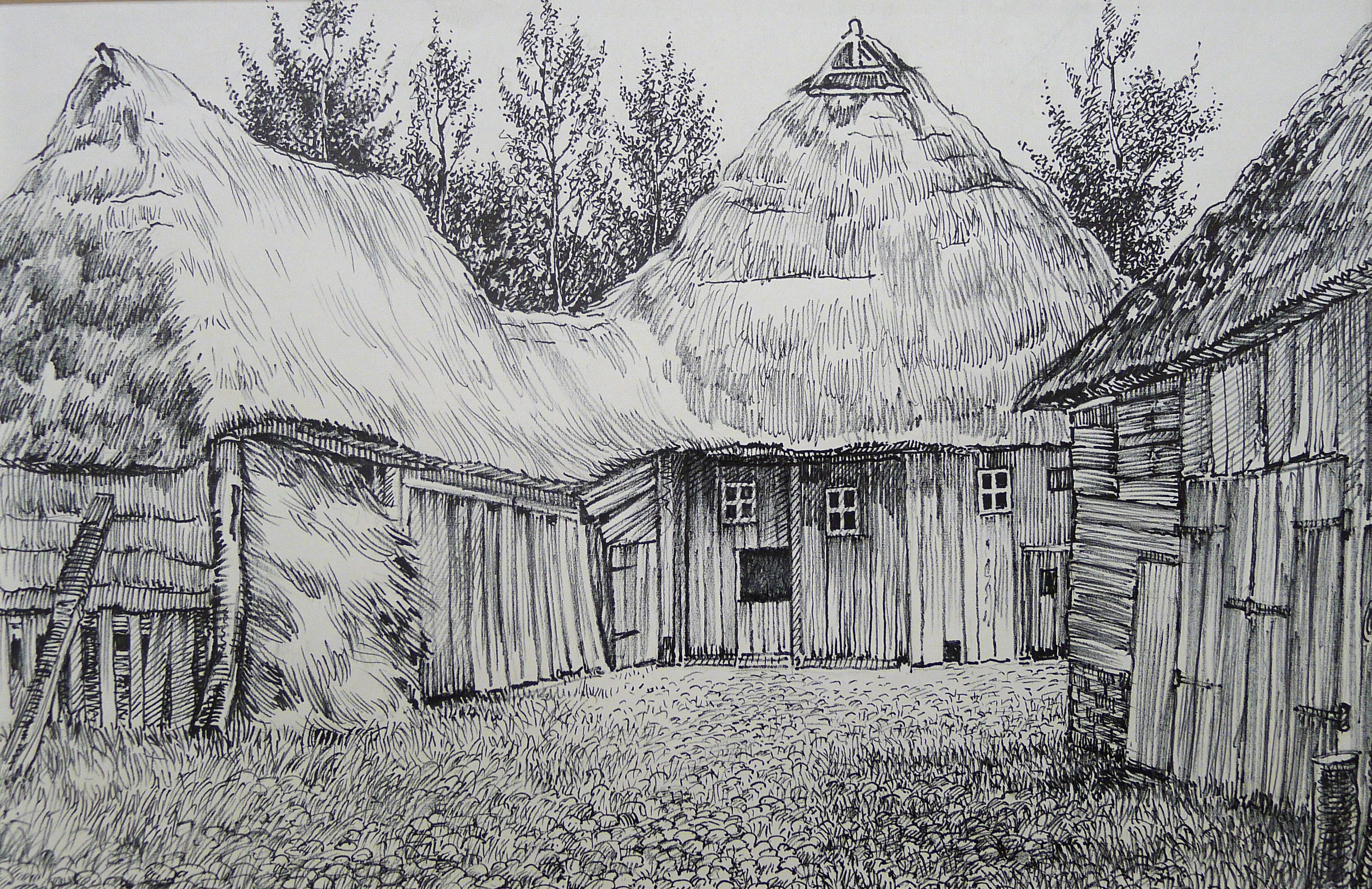 Het is zomer wat blijkt uit de bomen die vol in blad zijn. Door de rechter schuur is er een duidelijk perspectief ontstaan. De tekening bevat veel details in vooral de rieten daken en de houten planken.