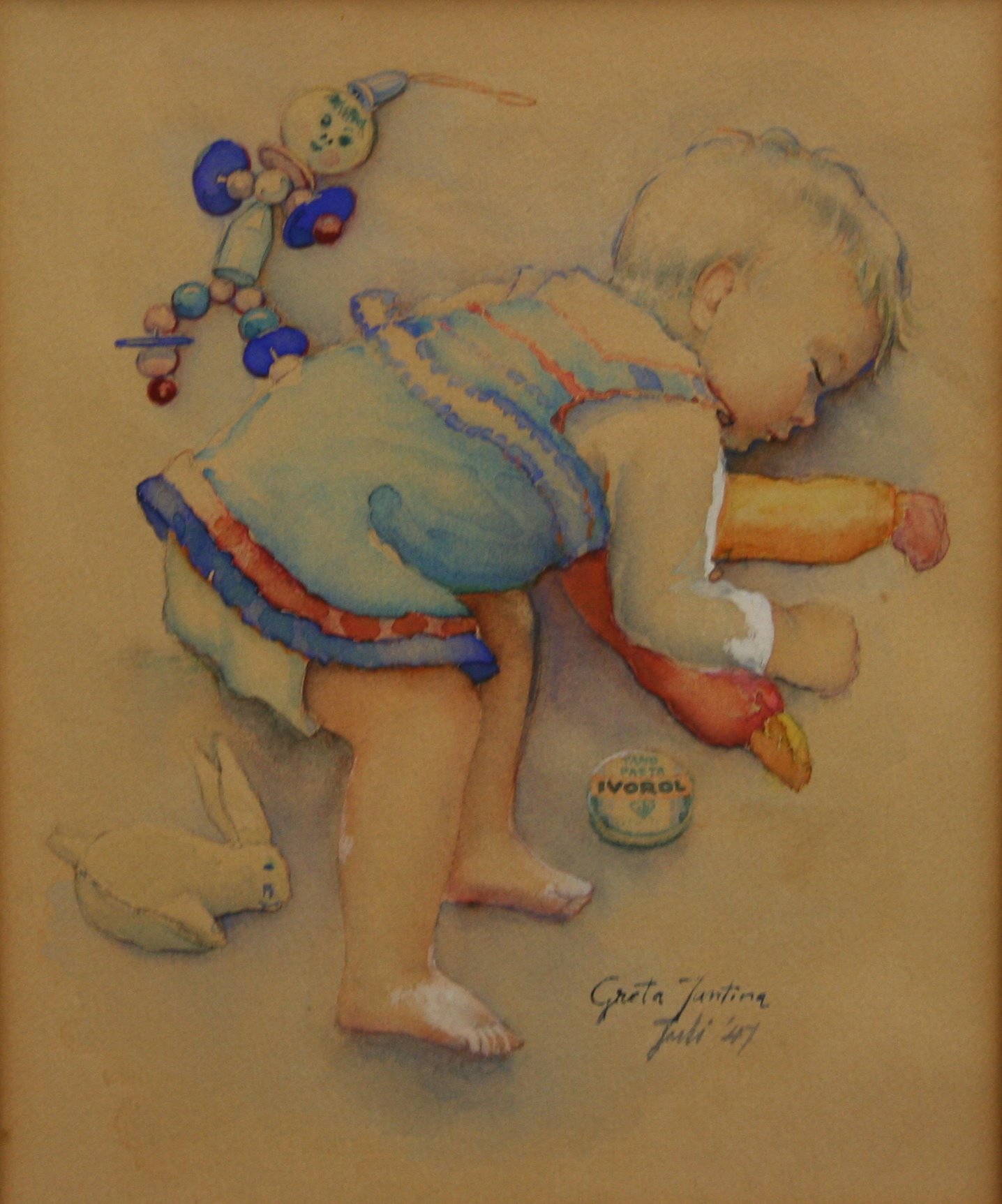Greta Hoving als baby in de box. Ze heeft blond haar. Ze ligt op haar linkerzij te slapen. Ze is gekleed in een blauw jurkje met rode strepen bij de boorden en draagt een luier. Naast haar ligt speelgoed: een houten pop en een wit konijn als knuffel en een rond doosje waarop de letters 'Ivorol' staan.
