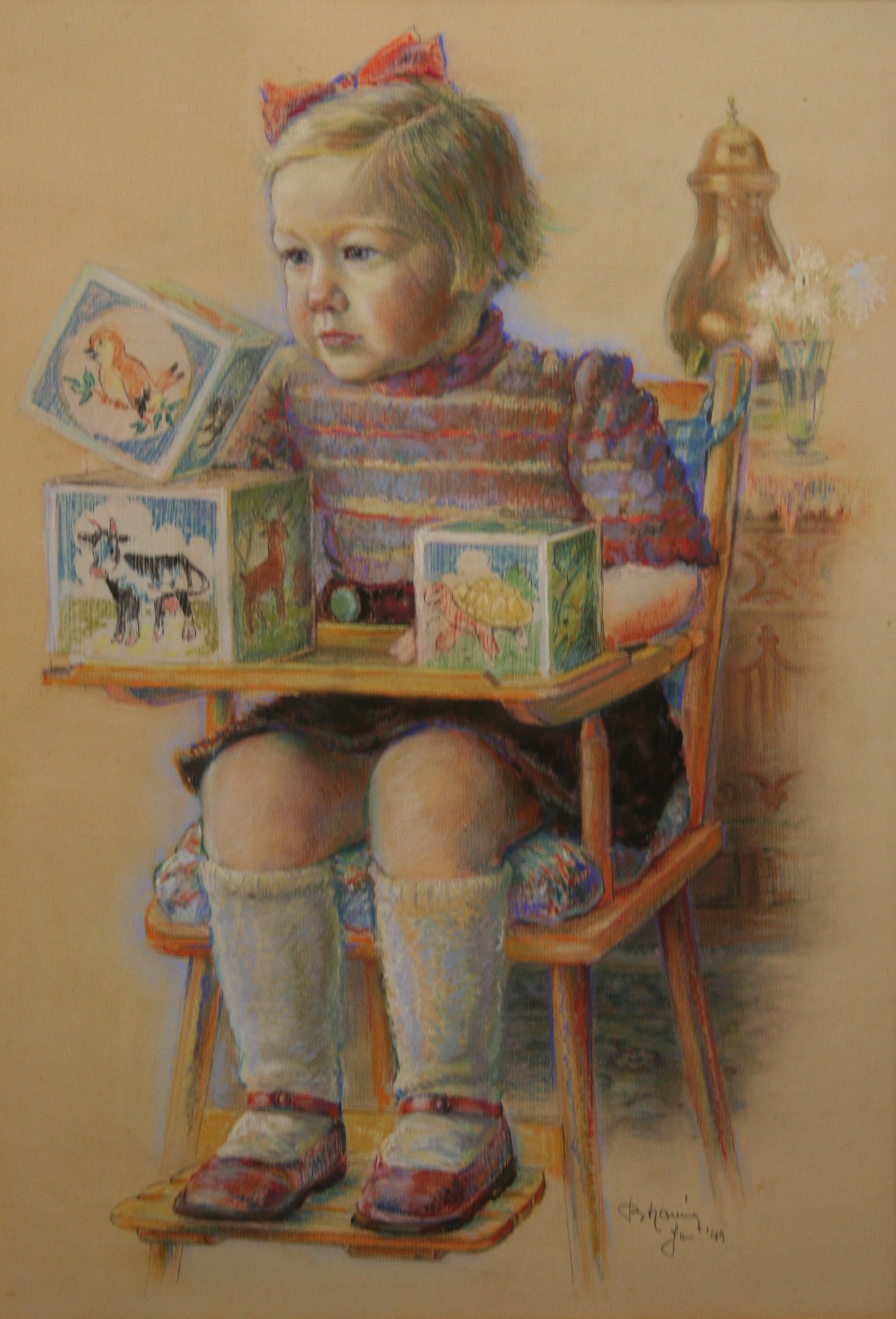 Kleurrijk portret en face van de jonge dochter van de kunstenaar als kleuter. Ze zit in een houten kinderstoel, met een bont gekleurd kussen op het zitvlak en een blauwwit geruit kussen op de rugleuning. Ze heeft blond haar, rode wangen en blauwe ogen. Haar haar is in een scheiding aan haar linkerzijde. Bovenop haar hoofd draagt zij een oranje met blauwe strik. Ze draagt een gestreept truitje met korte mouwen in verschillende kleuren, een donkerbruin rokje, grijze kousen tot aan de knieƫn en rode schoentjes. Haar voeten heeft ze op het plankje van de kinderstoel gezet. Voor haar op het plankje ligt speelgoed. Het zijn drie kubussen met op alle zijden vrolijke, kleurige afbeeldingen van dieren. Achter de kinderstoel staat een houten, bewerkte dressoir met erbovenop een koperkleurige kruik en een kleine glazen vaas met witte bloemen.