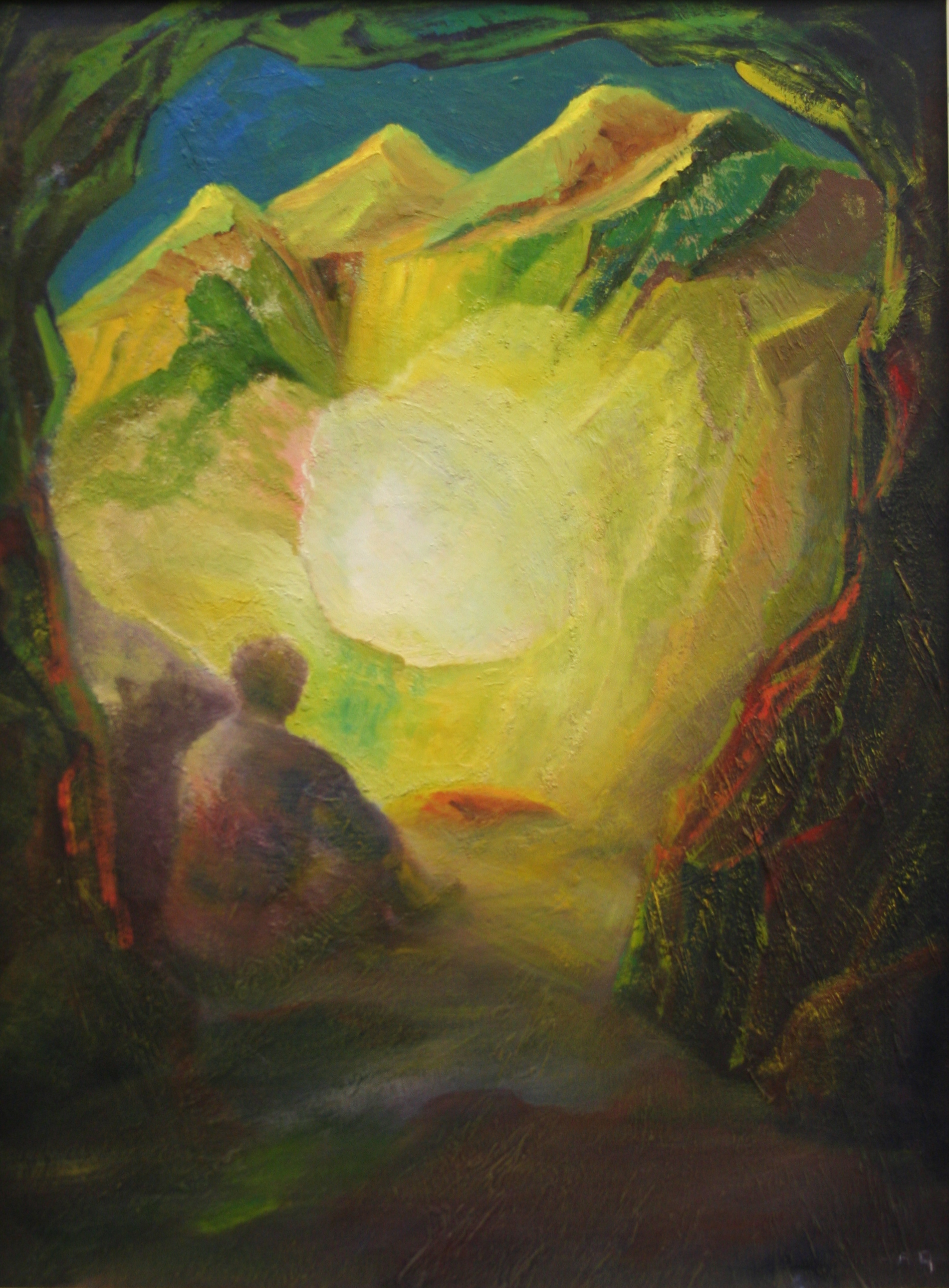Een denker zit op de grond in de opening van een grot en kijkt naar de harde, hoge, kale bergtoppen en de donkerblauwe lucht. Hij ziet een hoopgevend licht in de wereld, dat meteen de aandacht trekt. De bergen en de ingang van de grot worden door het licht verlicht. Verder de grot in is het erg donker, waardoor het werk enigszins somber is. Het perspectief is minder sterk dan zou mogen worden verwacht van de compositie van dit kunstwerk.
