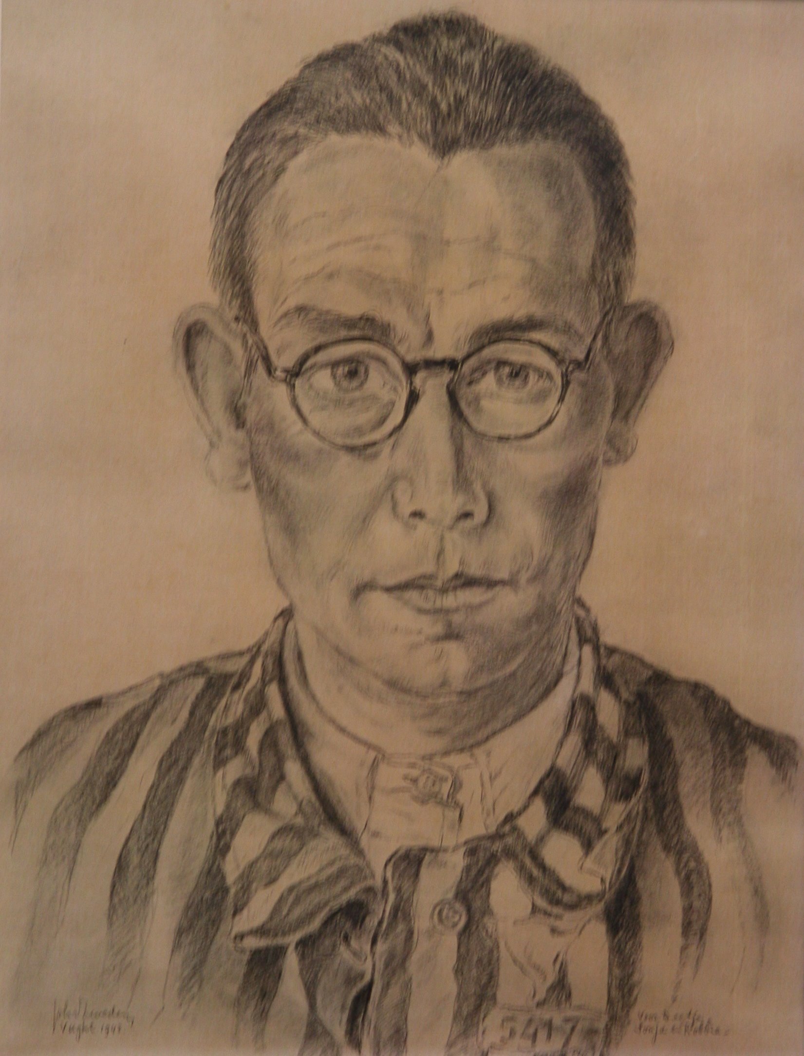 Zelfportret en face in concentratiekamp Vught. Hij heeft kort donker haar, dat naar achteren is gekamd. Hij draagt een bril met vrijwel ronde glazen en heeft op zijn voorhoofd en bij zijn mondhoeken rimpels. Hij is gekleed in een gestreept gevangenenkledij met eronder een licht overhemd. Op zijn borst staat het gevangenennummer gedrukt. Hij kijkt bedrukt.