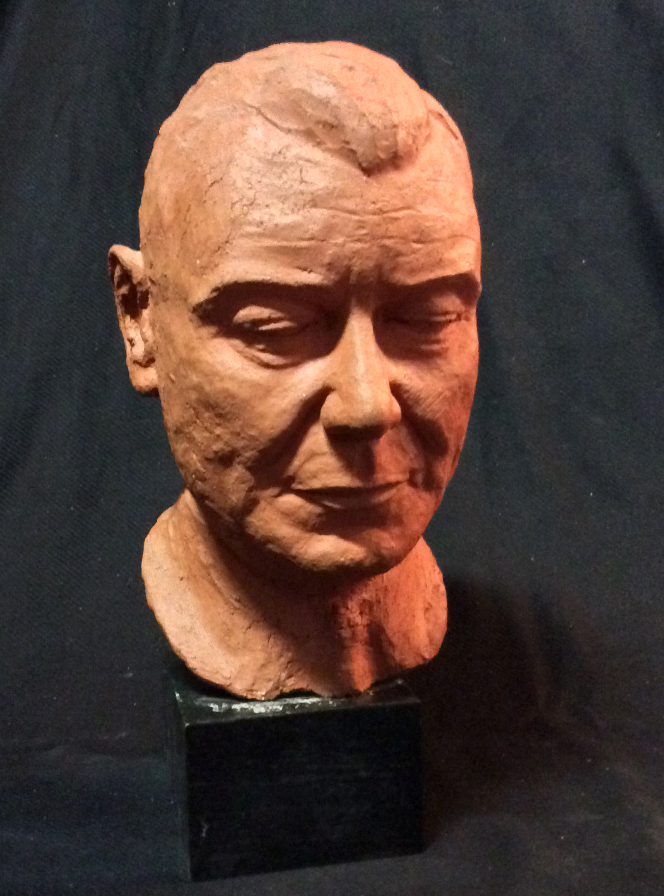 Beeld van een mannenhoofd op een zwart marmeren sokkel.