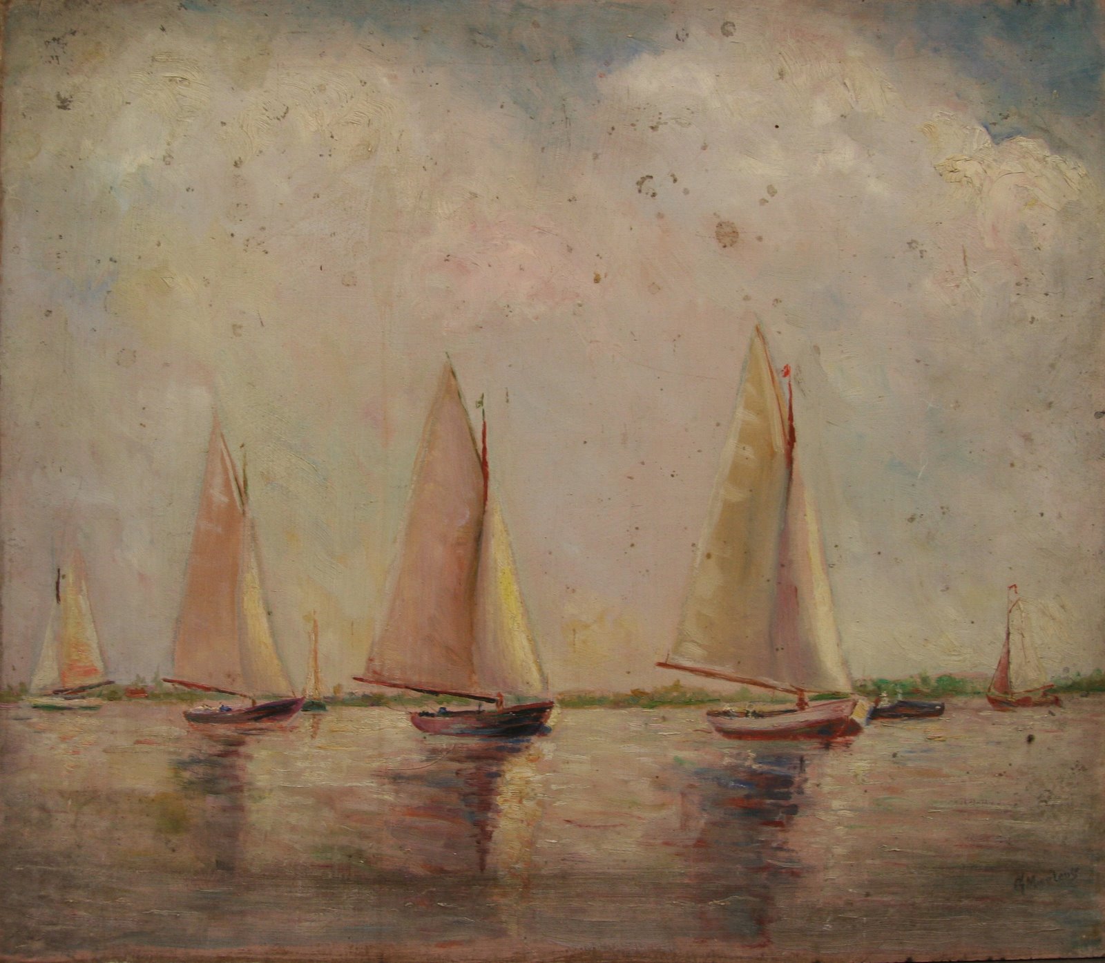 Zicht op een aantal varende vrijwel identiek zeilschepen. Ze hebben twee zeilen. Op de mast van elk schip wappert een vlaggetje. De schepen zijn weerspiegeld in het kalme water. Van het rechter schip op de voorgrond en het schip helemaal links is de bovenste helft wit. De onderste helft van de twee schepen zijn rood, betreffende het rechterschip, en groen. De twee schepen ertussen zijn volledig bruin.