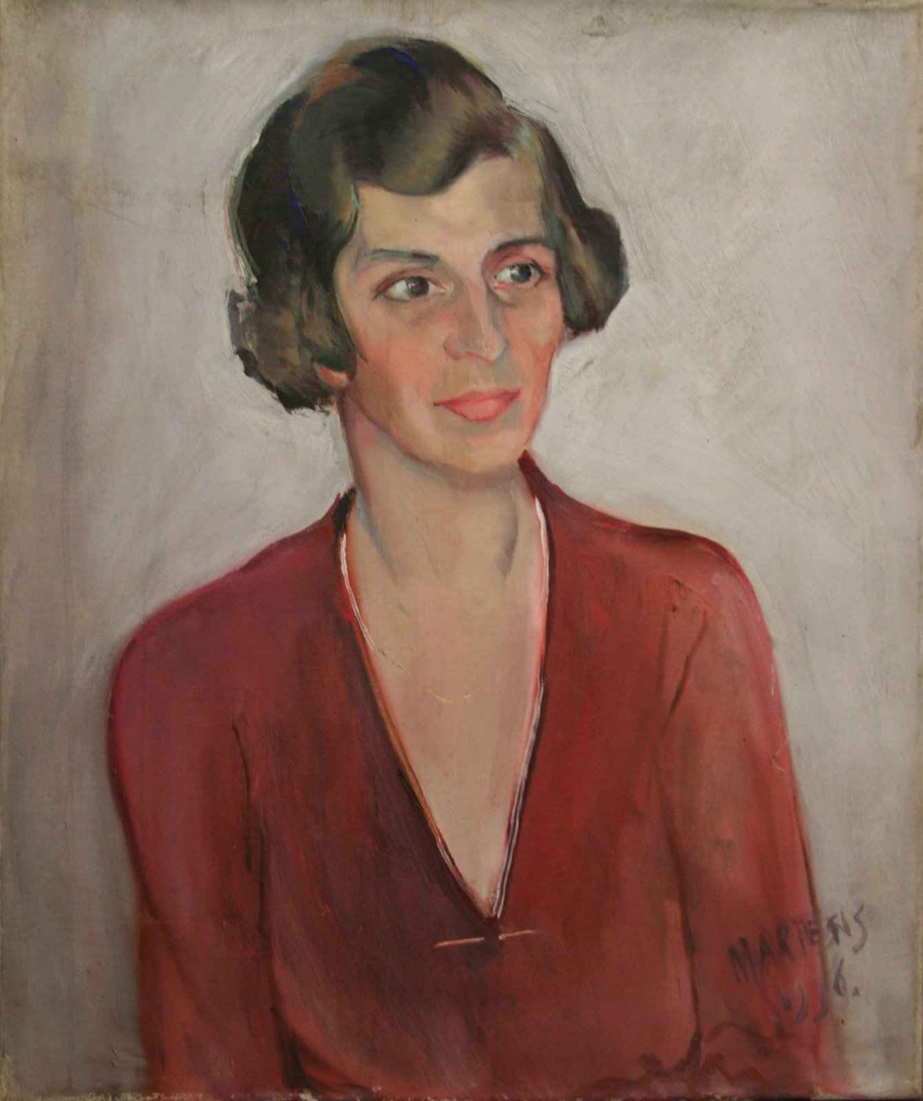 George Martens schilderde dit portret van een vrouw in 1936. In wat Casper Wechgelaer in Martens en Alida Pott – leven en werk, de derde van vier perioden noemt. Een periode die duurde van 1932 tot 1956. ‘De jaren van goede gezondheid, tochten met de tjalk ‘Alida’, en de eerste negentien jaar van zijn huwelijk met Carla.’ George leerde zijn eerste vrouw, Alida Pott, kennen toen ze samen aan Academie Minerva studeerden. Ze trouwden in november 1922, Alida overleed in 1931. In 1935, een jaar voor hij dit portret schilderde, hertrouwde George met Carla Uithof. George Martens wordt beschreven als een vrijpostige man, een haantje de voorste, een man met geldingsdrank en de brutaalste van de ploegleden. Hij was een boeiende en amusante verteller die graag de draak stak met anderen. Ondanks zijn uiterlijke bravoure was George ook een gevoelige man. Hij was kwetsbaar en bescheiden maar dat liet hij aan de buitenwereld zelden merken.