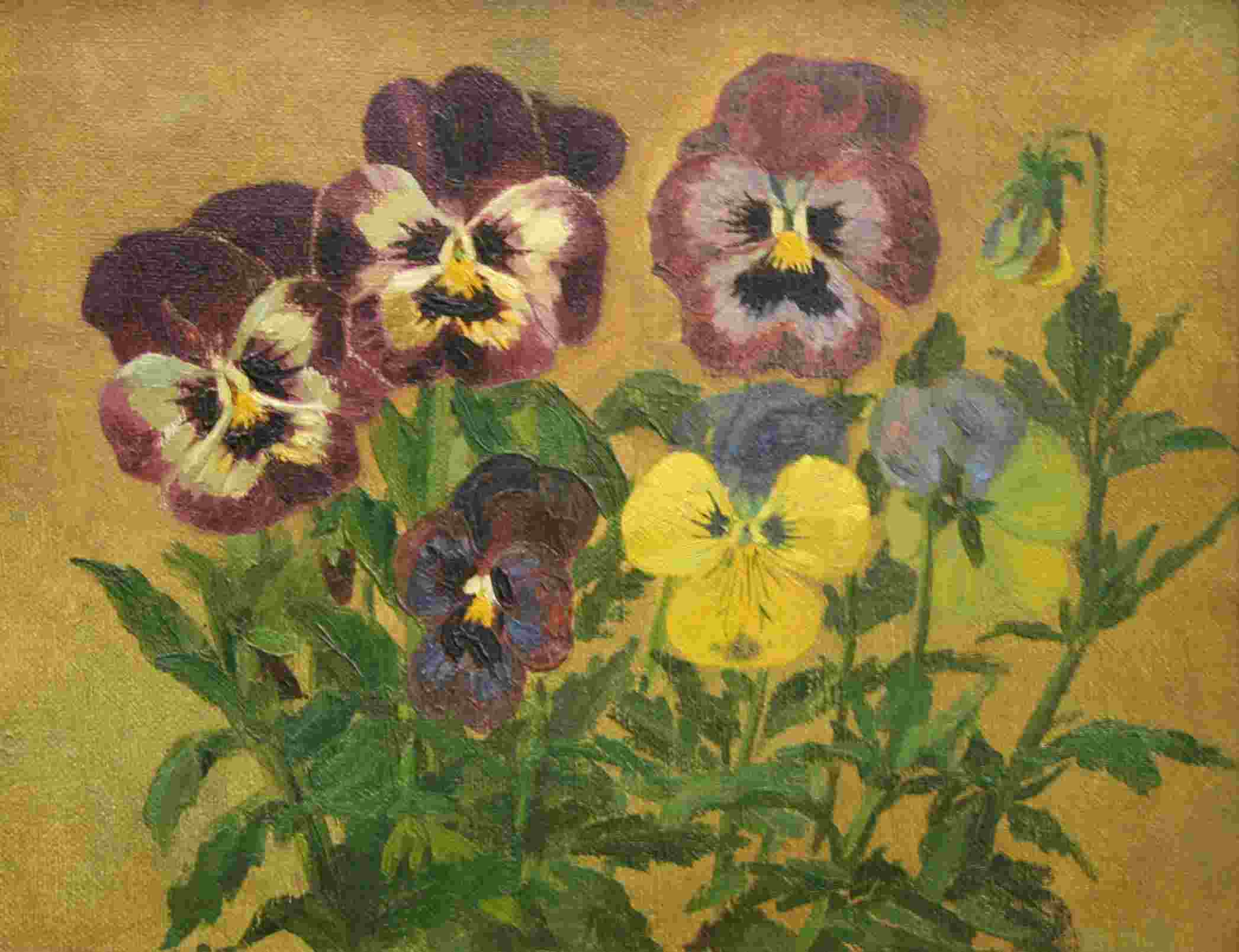 Natuurgetrouwe weergave van zes viooltjes in de kleuren paars-roze, paars-geel, paars-blauw en geel-blauw. De plantjes zien er goed uit: de stengels en bladeren zijn fris en groen.