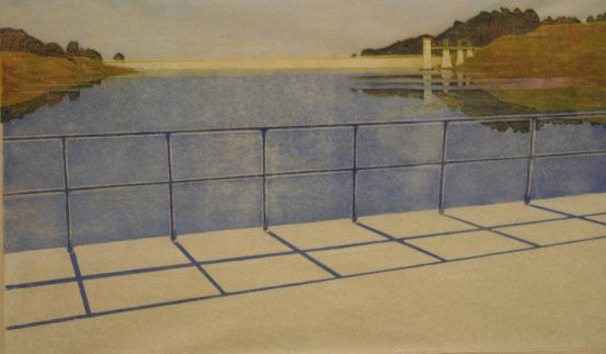 Houtsnede in meerdere kleuren met zicht op het Wentwood Reservoir in het zuiden van Wales met op de achtergrond een stuwdam. Het hek op de voorgrond met schaduw valt meteen op. De randen van het reservoir en de bomen aan de horizon zijn weerspiegeld in het water. Uit de schaduw en de weerspiegeling van de blauwe lucht blijkt, dat de zon schijnt.