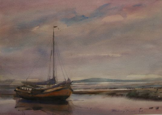 Tjalk aan de linkerkant die drooggevallen is. De zeilen zijn gestreken. Aan de rechterkant is gras te zien. Het water is kalm. Op de achtergrond bevinden zich groene beboste heuvels. De horizon is laag. Het is bewolkt met een paar stukken blauwe lucht. Het is lastig te bepalen in welk jaargetijde het kunstwerk is.