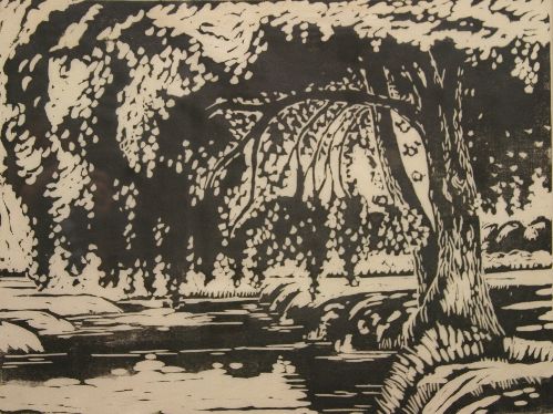Linosnede van een zicht op de Drentse Aa. Aan de rechterkant op de rechteroever staat een grote boom, waarvan de takken over het riviertje hangen en de afzonderlijke bladeren duidelijk zichtbaar zijn. De boom neemt een groot deel van het kunstwerk in en trekt dan ook meteen de aandacht. Verder groeit op beide oevers gras. In de verte staan aan de rechterkant bomen.