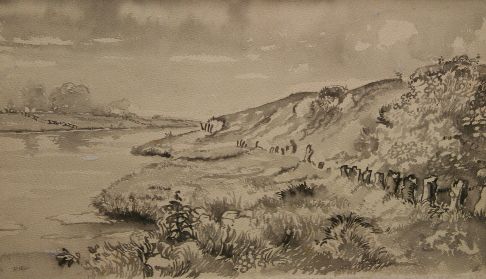 Zicht op het Reitdiep. Aan de rechterkant is de oever en de dijk afgebeeld. Hier groeien gras en kleine struiken. Waar de oever overgaat in de dijk staat een rij paaltjes. Aan de linkerkant is de andere oever zichtbaar, waar enkele bomen vol in blad staan. Het is rustig weer, wat blijkt uit het kalme water.