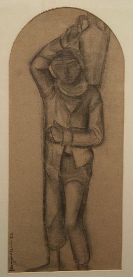 De contouren van zijn lichaam, kleding en kruik zijn dik aangebracht.