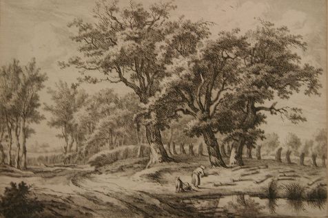 Zicht op een akker aan de rand van een bos. De drie grote, zeer gedetailleerde bomen in het midden van de gravure trekken meteen de aandacht. Onder de bomen is schaduw. Op de akker is een boerin aan het werk. Zij bundelt het gemaaide koren of riet. Aan de rand van de akker staan de riet- of korenschoven. Haar hond zit in haar buurt. Rechtsonder is een vennetje.