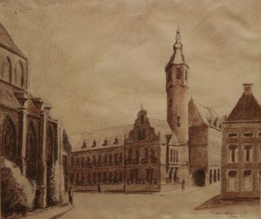 Blik op het Provinciehuis aan de St. Jansstraat te Groningen. Links is een deel van de Martinikerk met zichtbaar. Het is bewolkt. Het licht komt van rechts, waardoor de linkerkant van de toren, alsook het gebouw aan de rechterkant en de voorgevel van het Provinciehuis met de vele ramen en luiken in de schaduw zijn.