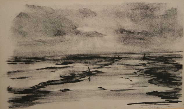 Zicht op de Waddenzee en het wad bij Noordpolderzijl. De lucht is bewolkt, maar in het midden schijnt de zon achter de wolken met haar zichtbare zonnestralen. Het water aan de linkerkant is kalm. Het wad in het midden is vlak en loopt aan beide zijden licht af. Er is groot contrast aangebracht door de donkere strepen en vegen in het kunstwerk.