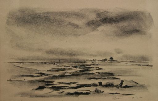 Zicht op de Waddenzee en het drooggevallen wad in het midden. Het is bewolkt. Het water aan de linker- en rechterkant is kalm. Er is een groot contrast aangebracht door de donkere strepen en vegen in het kunstwerk.