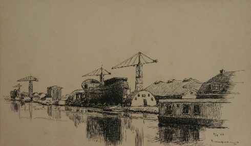 Zicht op een werf aan het Winschoterdiep te Groningen. In het midden van de tekening ligt een groot schip in aanbouw. Opvallend zijn de vier kranen op de wal. Aan de rechterkant ligt een woonboot in het water. Daarboven staan gebouwen. De gebouwen, schepen en kranen zijn weerspiegeld in het kalme water.