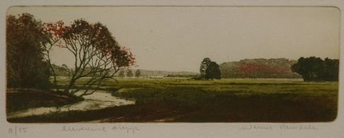 Zicht op het Lieverse Diepje in Drenthe. Het riviertje aan de linkerkant maakt een bocht naar links, met in de bocht een groep bomen. Rechts van het riviertje ligt een groen weiland, dat het grootste deel van het kunstwerk beslaat. Op de achtergrond bevindt zich het bos. De lucht is egaal grijs en saai. Afgaande op de rode gloed in de halfkale hoge boom aan de linkerkant en het bos in de verte is het herfst.