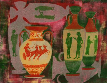 De drie kruiken zijn ook gestileerd afgebeeld onder en achter de amfora's in de kleur paarsgrijs. Deze vlakken komen qua omvang overeen met de daadwerkelijke kruiken. De figuren in groen zijn dezelfde als die op de kruiken rechts.