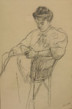 Weergave van een lezende vrouw in een rotan stoel. De vrouw is gekleed in een lange jurk. Haar haar heeft ze opgestoken. In haar linkerhand houdt ze een dichtgeslagen boek. Het meest gedetailleerd op deze tekening zijn het hoofd van de vrouw en de rotan stoel. Er zijn zeer weinig schaduwpartijen en details aangebracht.