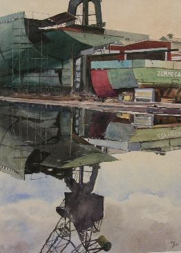 Weergave van twee vrachtschepen in aanbouw op een scheepswerf. Het linker schip is donkergroen van kleur en is hoger dan het rechter schip, dat rood, blauw en groen is. Op de achtersteven van dit schip staat in witte letters het woord 'Jummega'. Het linker schip staat op het droge, wat blijkt uit de achtersteven, die hoog boven het water uitsteekt. Voor dit schip staat een steiger. Achter het rechter schip staan loodsen. Bovenaan is het onderste deel van een bokkraan zichtbaar. Het merendeel van het werk wordt ingenomen door water. Door het kalme water wordt het geheel zeer goed weerspiegeld. Door de hooggeplaatste oever is in het water zelfs meer zichtbaar dan op het droge. Zo is niet alleen het onderste deel van de kraan zichtbaar maar ook de delen van de giek. Ook is te zien dat het niet geheel bewolkt is: in het water zijn wolken afgewisseld met blauwe lucht afgebeeld. De kleuren van de schepen zijn in het water wel fletser dan in werkelijkheid.