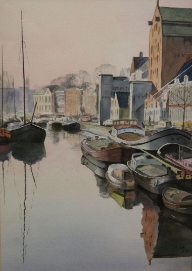 Zicht op de Noordhaven in Groningen. Zowel aan de linkerkant als aan de rechterkant liggen meerdere binnenschepen en kleinere boten. De schepen aan de linkerkant hebben masten. Rechts zijn gebouwen, waarvan enkele pakhuizen, in verscheidene kleuren afgebeeld. Het water is kalm, waardoor de schepen, bootjes en gebouwen heel goed zijn weerspiegeld.