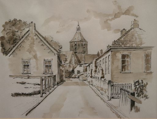 Zicht op de hervormde Sint-Hippolytuskerk in Middelstum ten noordoosten van de stad Groningen. Aan weerszijden van de weg staan woonhuizen met door hekken omheinde tuinen. Het dak van de kerktoren heeft een vierzijdige kap met een open klokkenkoepel. De gedeeltelijk vage contouren in de lucht geven aan dat het bewolkt is. Afgaande op de bomen, die vol in blad staan, is het in de late lente of zomer. Het perspectief is duidelijk weergegeven door de rechte lijnen van de weg in het midden op de voorgrond en de huizen aan weerszijden hiervan. De kerktoren met een deel van de kerk staat in het midden van de tekening. Mede ook door het perspectief trekt de kerk de aandacht.