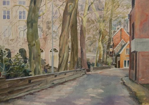 De zon schijnt, wat blijkt uit de schaduwpartijen van de gebouwen in de verte en tot halverwege de weg. Het is waarschijnlijk herfst, want enkele takken van de hoge bomen hebben geen bladeren. Bovendien zijn de afgbeelde bladeren bruinkleurig. De duidelijkste kleuren hebben de bomen en de gebouwen in de verte en aan de rechterkant. De verschillende tinten bruin overheersen.