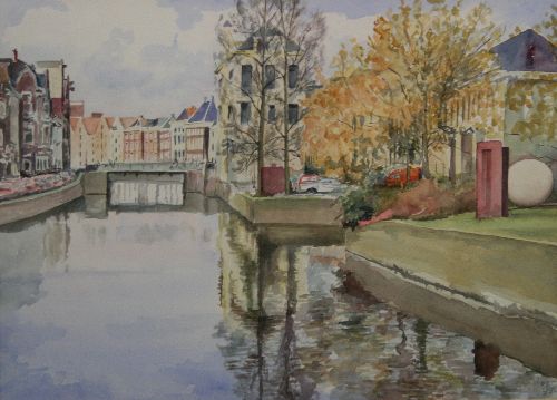 Het is half bewolkt. Vooral in het water is blauwe lucht te zien. Het is op deze aquarel herfst, wat blijkt uit de herfstkleuren van de bladeren aan de bomen. Er zijn allerlei kleuren gebruikt in vooral lichte tinten. Er is veel perspectief aangebracht door de lange kades.
