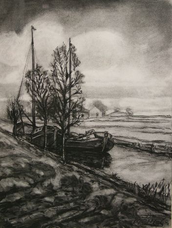 In de lucht zweven grote stapelwolken. Het is zeer waarschijnlijk herfst, afgaande op het kale akkerland en de halfkale bomen. Door de donker afgebeelde bomen en schepen en de lichte stapelwolken is er een groot contrast ontstaan.