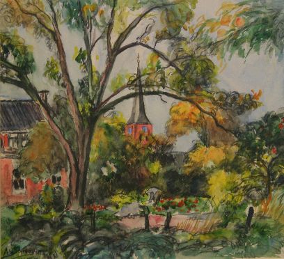 Zicht op de toren van de romanogotische kerk van Ulrum ten noordwesten van de stad Groningen. De toren is gebouwd van rood baksteen en heeft een grijs dak. Onder de torenspits bevindt zich op elke zijde van de vierkante toren een klok. Het kunstwerk wordt gedomineerd door een grote boom aan de linkerkant, waarvan de takken tot aan de rechterkant reiken. De boom oogt zeer groot doordat deze niet geheel is afgebeeld. Zowel aan de linker- als bovenkant reiken de takken verder dan de rand van het kunstwerk. Aan de linkerkant staat een huis met rode bakstenen en een grijs dak van dakpannen. Op de voorgrond groeien lage struiken. Ook is er een paadje waarlangs houten paaltjes staan. Aan de rechterkant en in het midden voor de kerk staan allerlei bomen. Aan de boom rechts hangen rode vruchten. Vooral door de grote boom ontstaat er veel diepte in het kunstwerk.