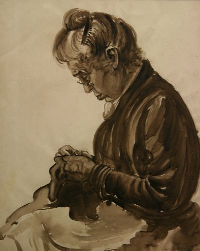 Weergave van een oude vrouw en profile, die aan het naaien is. Ze heeft haar haar opgestoken. Ze draagt een bril. Ze is gekleed in een donker jasje, met eronder een wit kledingstuk. Ze buigt haar hoofd voorover en kijkt aandachtig naar haar naaiwerk. Het is niet duidelijk wat ze aan het naaien is. Vooral haar hoofd en handen zijn gedetailleerd afgebeeld.