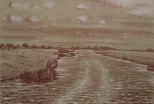 Zicht op het Reitdiep bij Wierumerschouw ten noorden van de stad Groningen. Vooral op de linkeroever groeien waterplanten. Aan de linkerkant is de dijk, waarop gras groeit en paaltjes de grenzen van het grasland aangeven. Boven de dijk staan een paar huizen en bomen. Aan de horizon zijn eveneens bomen afgebeeld. Aan de rechterkant is weiland. Het Reitdiep neemt een groot deel van het kunstwerk in beslag. Het water is vrij kalm. Er zijn kleine golven. In het midden zijn met twee lichtere strepen aangegeven, dat er zojuist een boot in de richting van de kijker is langsgevaren. Het Reitdiep is in het midden van het kunstwerk afgebeeld, waardoor het perspectief zeer duidelijk wordt weergegeven.
