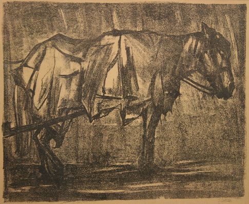 Zwartgrijze litho van een paard, dat stilstaat. Het paard trekt een kar voort, waarvan de balken van de lamoen zichtbaar zijn. Op het hoofd is een hoofdstel aangebracht. In de mond van het paard zit het bit. Ook zijn de teugels zichtbaar. De lijnen zijn sterk benadrukt en hebben verschillende diktes. Veel delen van het paard hebben schaduwpartijen: vooral de benen en het hoofd.