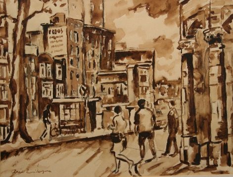 De kunstenaar heeft slechts één kleur, sepia, gebruikt voor dit kunstwerk, waarmee hij duidelijk onderscheid, middels lichte en donkere tinten, heeft gemaakt tussen de verschillende gebouwen.