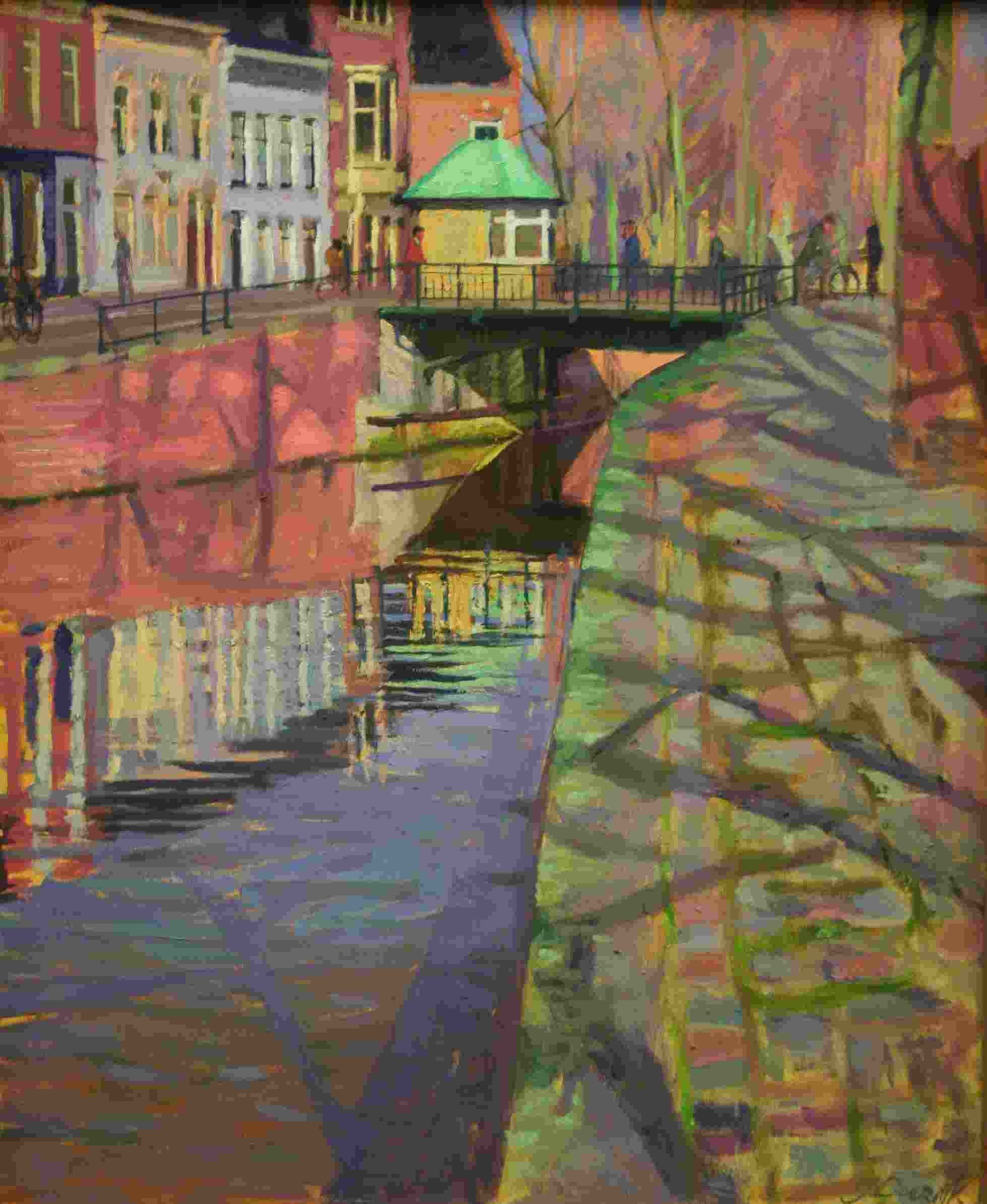 Kleurrijke weergave van de Visserbrug in Groningen. Het perspectief is vanaf de kade van de Hooge der A. Aan de overzijde staan huizen en het brugwachtershuisje. Deze zijn weerspiegeld in de gracht. In de verte is het Noorderplantsoen te zien. Aan de rechterkant is op de kade de schaduw van kale bomen zichtbaar. Uit de blauwe weerspiegeling in het water blijkt, dat het helder weer is. Afgaande op de kale takken is het winter of begin van de lente.