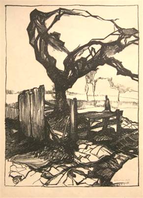 Gestileerde weergave van een boom bij Blauwborgje. De boom bestaat uit enkele rake lijnen, met een draaigroei zichtbaar in de stam, bekender van alleenstaande wilgen en eiken. Ondanks de wind ontmoeten de hoge takken elkaar in een keurige afsluiting van het beeld. De boom staat op de wasplaats bij het Blauwborgje, alleen een emmer die half achter de stam verscholen hangt wijst daarop. De entourage bestaat uit wat vervallen hekjes en verder donkere vlakken, die vooral lijken te dienen evenwicht in de compositie te scheppen. Links onderin is in spiegelbeeld in een cirkeltje de P van het Ploeglogo te zien. Op de steen tekende ze het in gewoon-beeld en rechts, waar ze normaal signeerde.