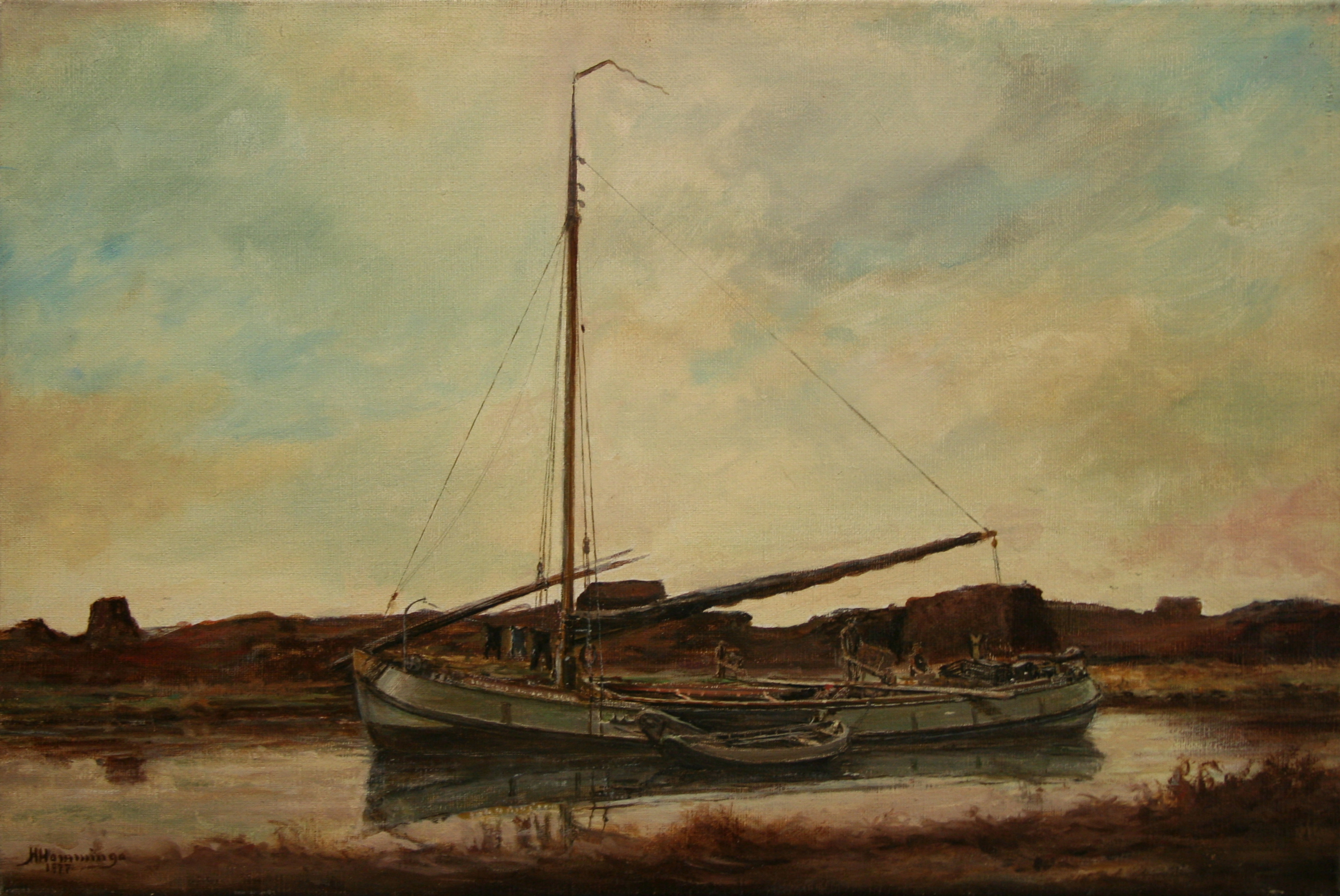 Weergave van een tjalk, die in het veen ligt. Naast de tjalk, waarvan het donkerbruine zeil is gestreken, ligt een kleine sloep. De tjalk is weerspiegeld in het kalme water. Personen zijn met kruiwagens bezig met laden of lossen van de tjalk. Op de voorgrond en aan de overzijde is bruine begroeiing. Het grootste deel van het kunstwerk wordt ingenomen door de lucht, die redelijk bewolkt is.