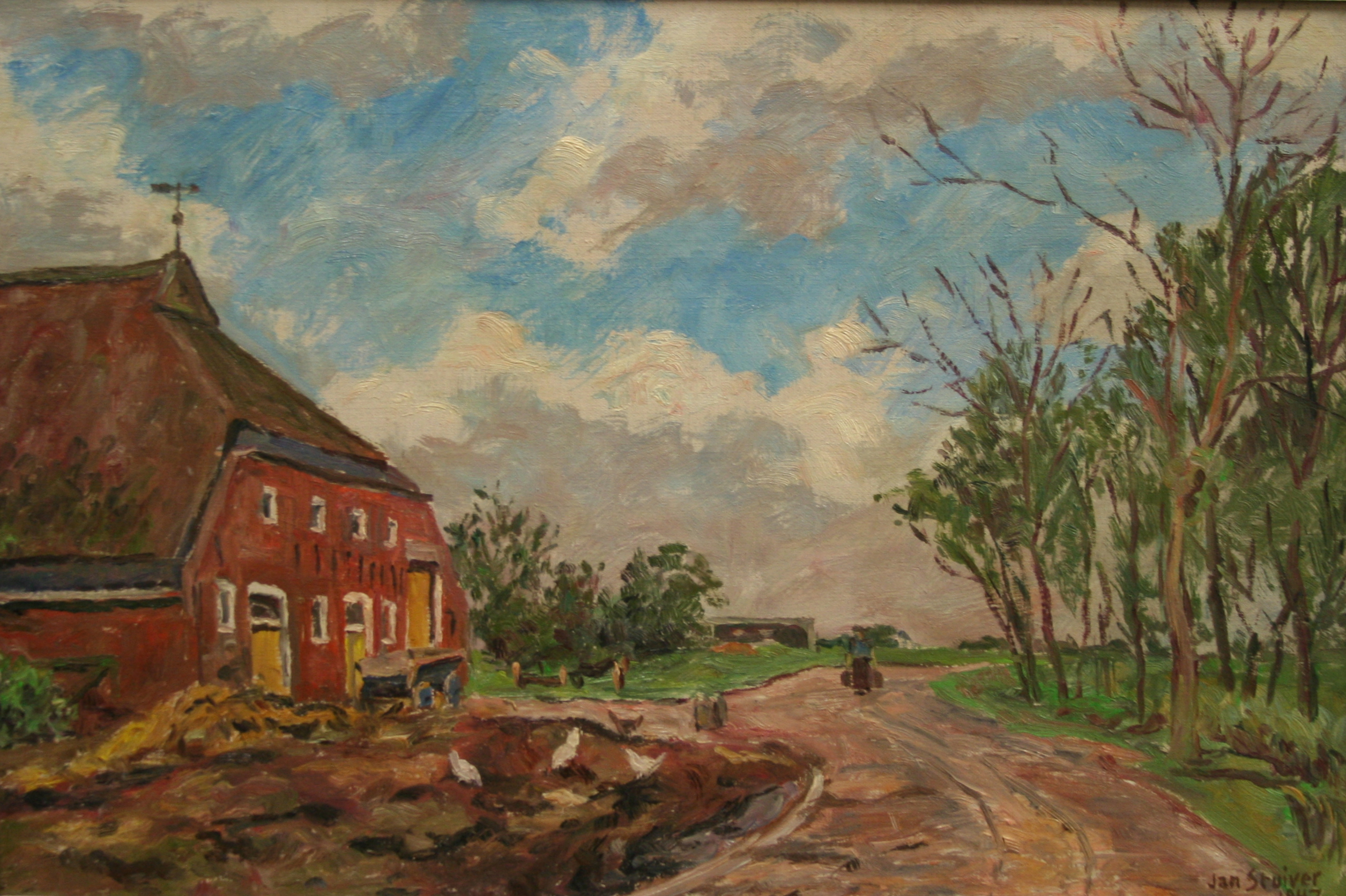 Zicht op een landweg en boerderij bij Winneweer ten noordoosten van Groningen. Aan de linkerkant staat gedeeltelijk een grote boerderij met een rieten dank en gevels van rode bakstenen. De kozijnen van alle ramen en deuren zijn wit. De deuren zijn okergeel. Bovenop het dak staat een windwijzer. Voor de boerderij ligt een berg stro of geel zand en staat een houten boerenkar. Tussen de weg en de boerderij lopen en pikken witte kippen in de donkere aarde. De landweg loopt vanaf het midden van de voorgrond door richting de lage horizon en verdwijnt achter het groepje bomen, dat rechts van de weg is. Midden op de weg loopt in de verte een vrouw, die tassen of melkbussen draagt.