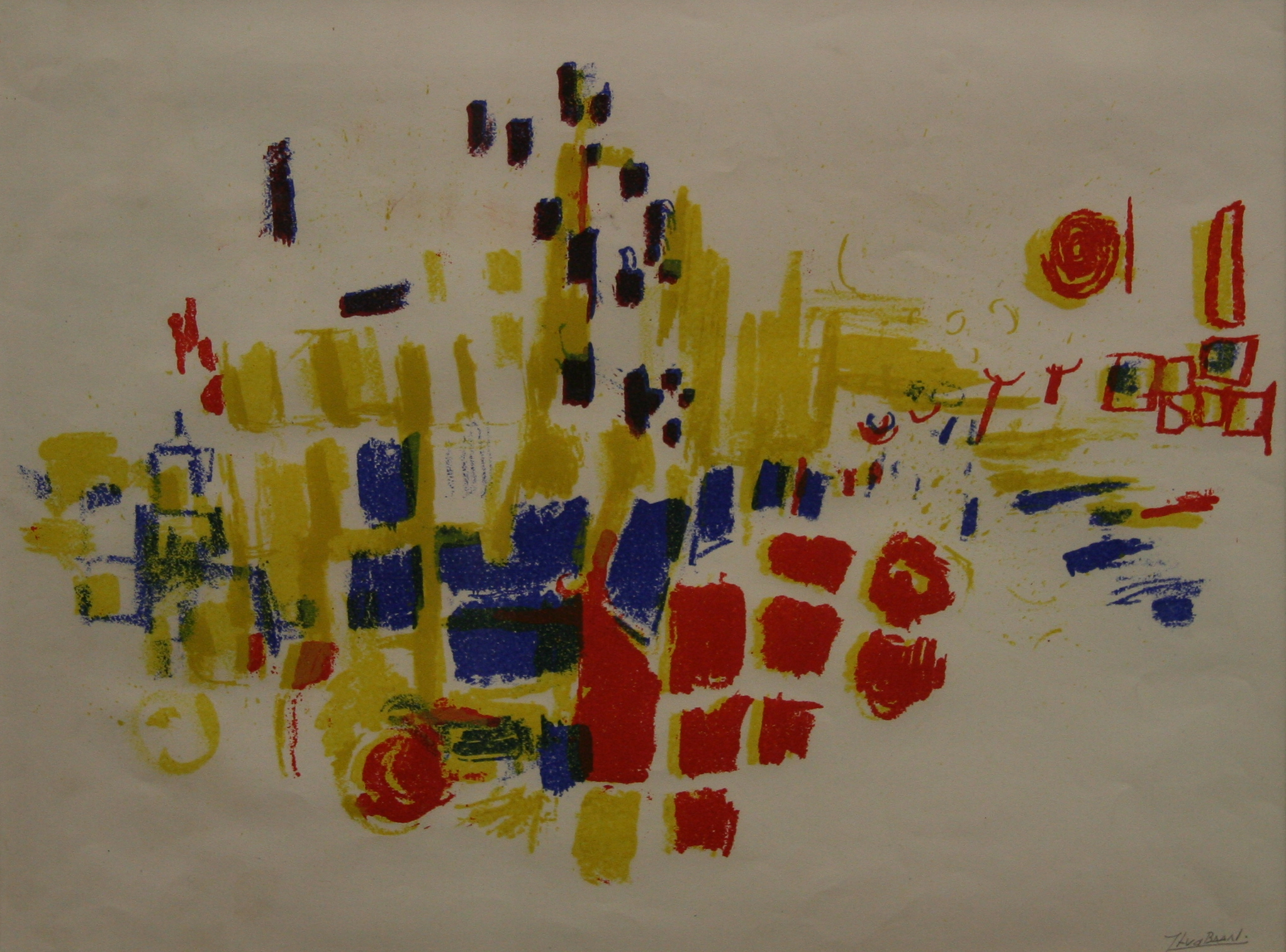 Abstracte compositie van kleurrijke vlakken van verschillende grootte. De gele kleur is in tegenstelling tot het blauw, rood en donkerblauw over het gehele werk aangebracht. De vlakken zijn als groep in een soort ruitvorm op het werk aangebracht.