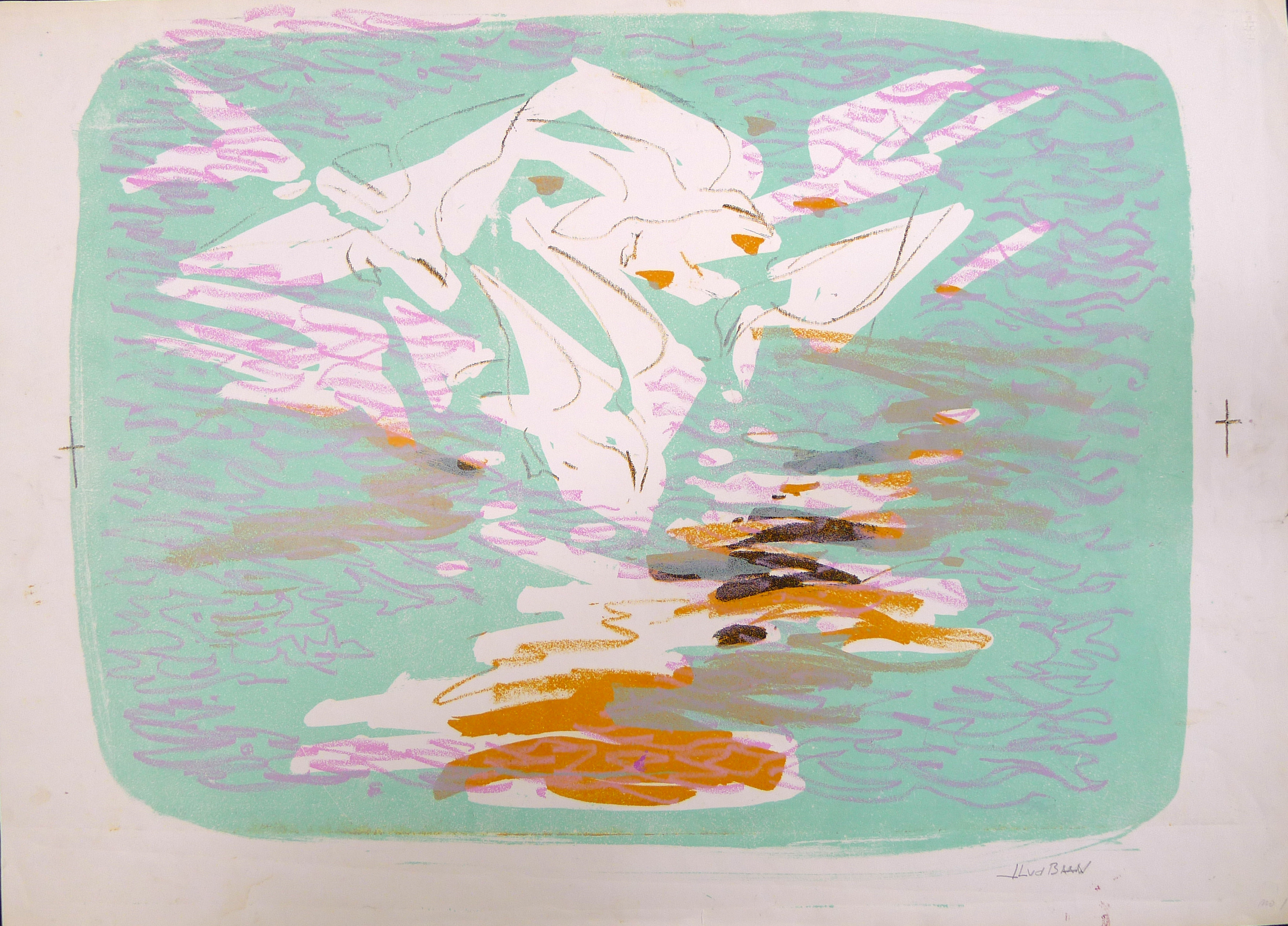 Abstracte weergave van het wad met meeuwen. Tegen een lichtgroene achtergrond is het wad in oranje, wit, lichtgrijze en zwarte tinten afgebeeld. Het wad bestaat uit brede strepen zigzaggend aangebracht. In de lucht vliegen enkele meeuwen. De vleugels en de oranje snavels zijn te herkennen. Over het gehele werk zijn golvende lijnen in roze aangebracht.