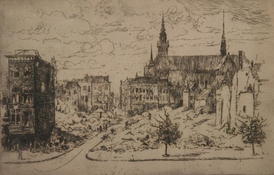 Zicht op de Stoeldraaierstraat in het centrum van Groningen. De donkere gebouwen in het midden rechts trekken meteen de aandacht. Het is de rooms-katholieke in neogotische stijl gebouwde Sint-Martinuskerk, die inmiddels is afgebroken. Op het dak aan de rechterkant staat de opvallende smalle spitse toren. Achter de kerk is de toren van het in neo-Renaissance stijl gebouwde Academiegebouw te zien. Voor de kerk staan gebouwen en deels of geheel ingestorte gebouwen. De weergegeven schade is ontstaan tijdens de bevrijding van Groningen aan het einde van de Tweede Wereldoorlog in april 1945. Op de voorgrond is de Vismarkt afgebeeld, met een tweetal bomen. Aan de linkerkant staat een groot gebouw met erkers op de eerste en tweede verdieping.